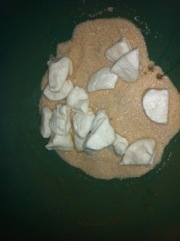 First you begin with a sugar and cinnamon mixture. (I’ll give you the recipe, don’t worry). You can put it mixture in a bag to shake, but I prefer a big bowl.