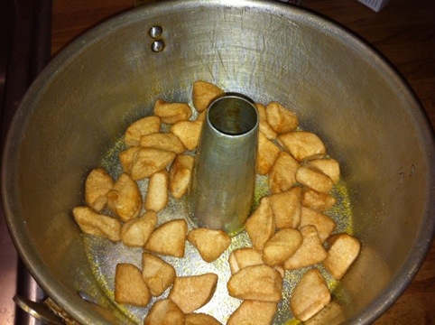 Pull the coated pieces out of your bowl and place into a well greased bundt pan. Continue cutting, coating and placing pieces in the pan until you and finished all three tubes. Make sure you are evenly spacing them while you build up in the pan.
