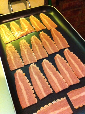 Turkey bacon sizzling on the griddle. Turkey? Well, I’m not going to buy regular bacon because it is too darn expensive! I’m not going to spend $3-4 for a pound of bacon! I only buy the stuff on sale and only if it is under $2.50 a lb. Plus, turkey bacon is supposedly better for you. Good for pigs everywhere, for turkey’s not so much.