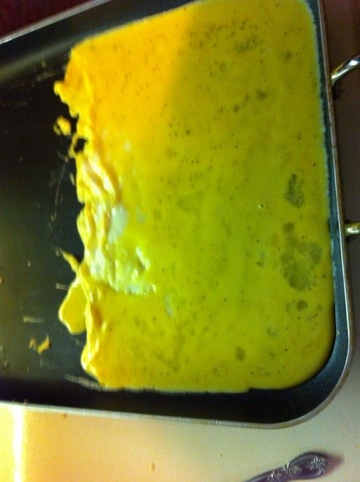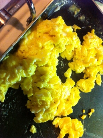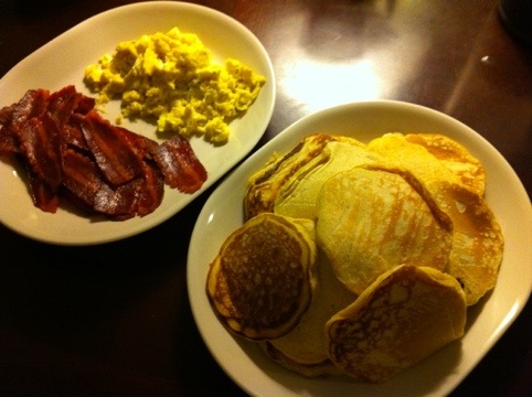 Normally, I would have used three pans to make breakfast. Usually, I can cook the eggs on on half and either the bacon or pancakes on the other half. Takes a little practice. You need to slowly pour the eggs on to the hot griddle and make sure you are “damming” them up with your pancake turner so they don’t spread across your griddle into the other thing you are cooking. It kind of is like hot lava, if you dam it up it will cook and make a edge. By the way, I made the eggs with 4 eggs, a splash of milk and some sea salt and black pepper.